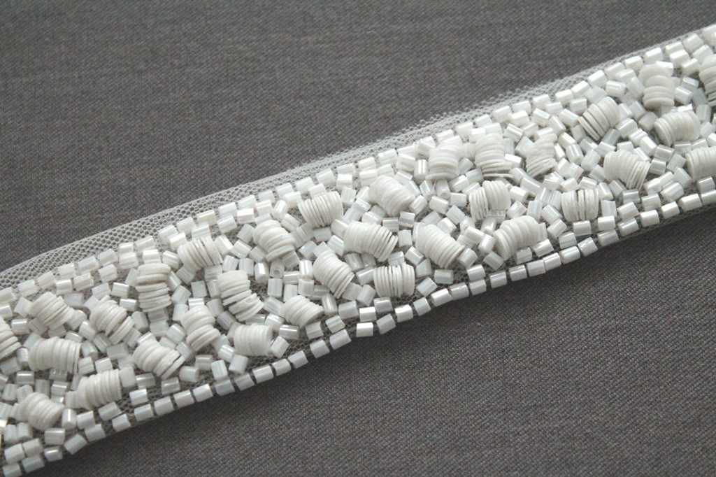 Молочная декоративная тесьма, вышитая сетка стеклярусом и пайетками шириной 2,5 см.